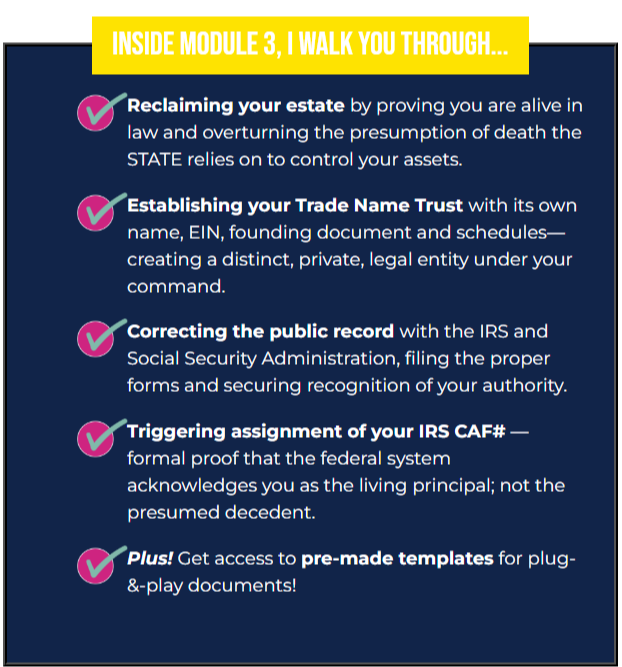 A Trade Name trust is only as strong as your ability to defend it. That’s why this bonus is priceless! You’ll receive a ready-to-use Motion to Dismiss, crafted to assert your rights when your trade name trust is improperly targeted in court.